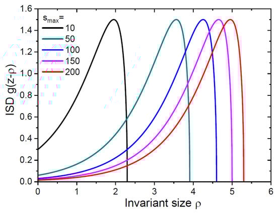 Figure 2. Continuum ISD over invariant size ρ   at different s m a x shown in the legend. Curves are obtained from Equation (33) at α = 3 and different z = l n s m a x .
