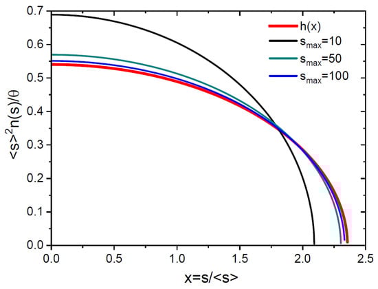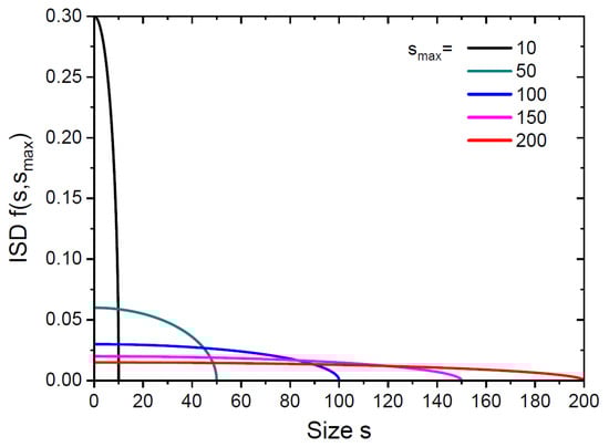 Figure 5. Scaled ISDs versus scaled size s / s at different s m a x shown in the legend. The ISDs rapidly converge to the universal scaling function given by Equation (39).