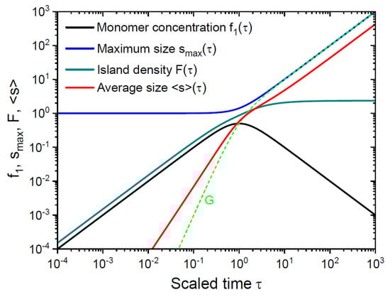 Figure 4 shows the monomer concentration f 1 ( τ ) , island density F ( τ ) , maximum size s m a x τ , average size s τ and total number of monomers in the islands G ( τ ) , obtained from Equations (30), (31), (35), (36) and (5). These graphs are given in a logarithmic scale to better show the island growth kinetics in the initial stage, that is, before reaching a maximum of f 1 at τ ~ 1 . This short nucleation stage is usually disregarded in scaling theories, most of which consider only the asymptotic stage at f 1 0 [14,15,22,37,38]. However, it is important in the overall mass balance, because a significant fraction of the islands nucleate at very short times. This is due to the fact that the maximum nucleation rate corresponds to the maximum of the monomer concentration. All curves shown in the figure contain no Λ dependence if expressed in terms of the scaled time τ = Λ θ . The monomer concentration decreases as 1 / τ in the large time interpolation, leading to a slow saturation of the island density in the asymptotic stage. These trends are well-known and have been reproduced by different methods [3,5,32,49]. The total number of monomers in the islands G approaches s m a x τ soon after reaching the maximum of f 1 . The average size s is much smaller than s m a x in the nucleation stage, but rapidly tends to a s m a x in the asymptotic stage.