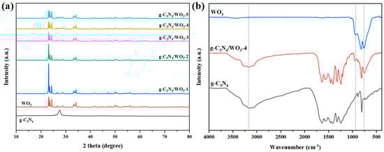 XRD patterns of all prepared samples (a), and FTIR spectra of g-C3N4, WO3, and g-C3N4/WO3-4 (b).