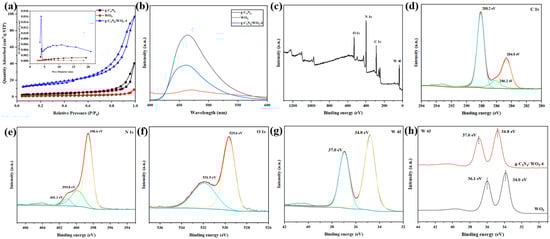 (a) N2 adsorption and desorption isotherms and pore size distribution curves (inset) of g-C3N4, WO3, and g-C3N4/WO3-4, (b) PL spectra of g-C3N4, WO3, and g-C3N4/WO3-4, (c) XPS survey spectrum of g-C3N4/WO3-4, high-resolution XPS spectra: (d) C 1s, (e) N 1s, (f) O 1s, (g) W 4f, (h) XPS of WO3 and g-C3N4/WO3-4 in the region of W 4f.