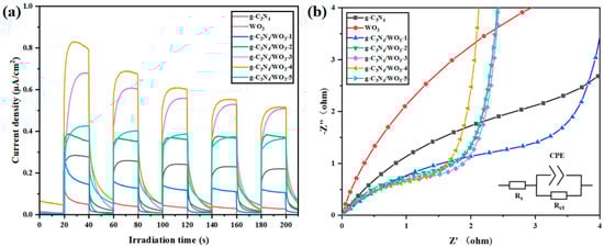 In order to study the electron migration rate and separation efficiency of different materials, the transient photocurrent response and electrochemical impedance were tested. Under visible light irradiation, g-C3N4/WO3-4 showed the highest photo current intensity in all samples (Figure 4a). This shows that the g-C3N4/WO3-4 composite had better photogenerated electron–hole separation efficiency than g-C3N4 and WO3. This may have been due to the formation of a heterojunction between g-C3N4 and WO3, which hindered the recombination reaction. Over time, the intensity of the photocurrent decreased slightly, which may have been due to the accumulation of holes. In addition, the migration rate of the samples’ photogenerated charge was also studied via EIS testing (Figure 4b). The radius of the arc is proportional to the charge transfer resistance, and the smaller the radius of the arc, the lower the charge transfer resistance. Equivalent circuits (inset in Figure 4b) were also proposed for further analysis of EIS plots. In the formula, Rs is the solution resistance, CPE is the constant phase element, and Rct is the interfacial charge–transfer resistance. As can be seen from Figure 4b, the arc radius of each of the composites was significantly smaller than that of g-C3N4 or WO3. This shows that g-C3N4/WO3-4 exhibited the fastest interfacial charge transfer and the most effective photogenerated charge carrier separation. Therefore, the combination of g-C3N4 and WO3 greatly promoted charge separation, thus improving the photocatalytic efficiency. To investigate the electron transfer rates of different catalysts, we calculated the cyclic voltammetry (CV) curves and the results are shown in Figure S1. The current peak density in the CV curve reflects the electron transfer rate of the measured material; a higher current peak intensity indicates a higher electron transfer rate. From the figure, it can be clearly observed that compared with g-C3N4 and WO3, the CV curve of g-C3N4/WO3-4 contained a larger loop and had a higher photocurrent density. The above results indicate that the recombination of g-C3N4 and WO3 can better inhibit the recombination of photogenerated electrons and holes.