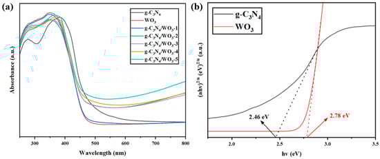 The optical properties of the synthetic catalysts were studied by measuring their UV-vis DRS. As shown in Figure 5a, the absorption edges of g-C3N4 and WO3 appeared at 485 nm and 470 nm, respectively. Compared with g-C3N4 and WO3, the light absorption intensity of the g-C3N4/WO3 composites was obviously enhanced at 500–800 nm, indicating that the combination of g-C3N4 and WO3 was able to utilize more visible light, thus improving the photocatalytic activity.