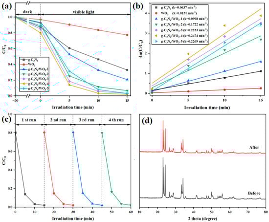 Rh B: [Rh B] = 20.0 mg/L, [catalyst] = 1.0 g/L, pH = 5.7. (a) Photocatalytic degradation curves and (b) fitted kinetics curves of all the samples, (c) cyclic degradation curve of g-C3N4/WO3-4, and (d) the XRD pattern of the g-C3N4/WO3-4 sample after 4th run cycle photocatalytic experiments.