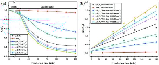 The photocatalytic degradation performance of Rh B was tested under visible light, as shown in Figure 6a. After adding the catalyst, the obtained samples were first subjected to dark adsorption for about 30 min, and the 20 mg/L Rh B aqueous solution changed slightly in the dark environment, which was attributed to the self-adsorption of the catalyst. Under visible light irradiation for 15 min, the degradation efficiency of g-C3N4/WO3-4 reached 97.9%. The photocatalytic degradation rate was clearly described using a pseudo-first-order kinetic function. It can be seen from Figure 6b and Table S2 that the g-C3N4/WO3-4 catalyst had the highest photocatalytic degradation rate constant (0.2474 min−1). The results show that the content of g-C3N4 had a great influence on the activity of WO3/g-C3N4 composites, and the optimum content of g-C3N4 was 4 g. When the amount of added g-C3N4 was higher than 4 g, the amount of WO3 was insufficient to construct an efficient heterojunction between g-C3N4 and WO3 to separate and transfer the photogenerated electron–hole pairs. When the content of g-C3N4 was too low and the content of WO3 was too high, the WO3 shell of the composite material became thicker, and the outer layer of WO3 was further away from the g-C3N4. The charge separation became less efficient, and the photogenerated electrons and holes were more likely to recombine during the movement process, reducing the rate of photocatalytic degradation.