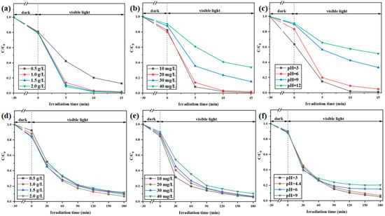 (a) Effects of g-C3N4/WO3-4 catalyst dosage on Rh B photodegradation ([Rh B] = 20.0 mg/L, pH = 5.7), (b) effects of Rh B initial concentration on the yield of Rh B photodegradation ([catalyst] = 1.0 g/L, pH = 5.7), (c) effects of pH on the photocatalytic activity of g-C3N4/WO3-4 in Rh B photodegradation ([Rh B] = 20.0 mg/L, [catalyst] = 1.0 g/L), (d) effects of g-C3N4/WO3-4 catalyst dosage on TC-HCl photodegradation ([TC-HCl] = 30.0 mg/L, pH = 4.4), (e) effects of TC-HCl initial concentration on the yield of TC-HCl photodegradation ([catalyst] = 1.0 g/L, pH = 4.4), (f) effects of pH on the photocatalytic activity of g-C3N4/WO3-4 in TC-HCl photodegradation ([TC-HCl] = 30.0 mg/L, [catalyst] = 1.0 g/L).