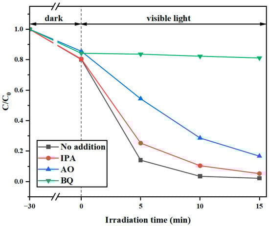 In order to study the main active groups in the reaction process, free radical capture experiments were conducted on g-C3N4/WO3-4. The hydroxyl radicals (·OH), holes (h+), and superoxide radicals (·O2−) generated during photocatalytic degradation were quenched using isopropyl alcohol (IPA), ammonium oxalate (AO), and benzoquinone (BQ) radical scavengers. From Figure 9, it can be seen that compared with the situation without inhibitors, the degradation efficiency decreased after adding inhibitors, indicating that ·OH, h+ and·O2− jointly participated in the photocatalytic degradation of Rh B by g-C3N4/WO3. After adding BQ, the photocatalytic activity of g-C3N4/WO3-4 decreased significantly, and the degradation efficiency was only 22.97%, indicating that ·O2− made a significant contribution to the degradation of Rh B in the photocatalytic system. After adding AO, the photocatalytic activity was also inhibited to a certain extent; therefore, h+ also played a certain inhibitory role. Compared with the degradation rate of Rh B with the addition of BQ and AO, IPA had the least effect on the degradation rate of Rh B.