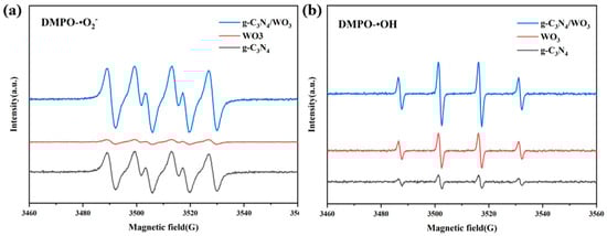 In order to further verify the direct Z-scheme mechanism, ESR measurements were used to detect the presence of ·OH and ·O2− radicals in the g-C3N4, WO3, and g-C3N4/WO3-4 photocatalytic systems under visible light.