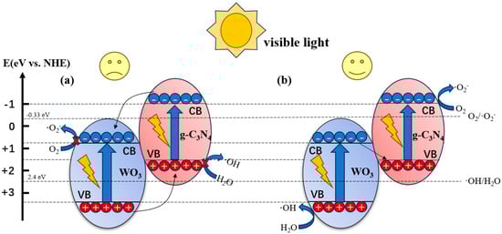 Two possible photocatalytic mechanisms of the g-C3N4/WO3-4 composite, (a) Type II mechanism and (b) Z-scheme mechanism.