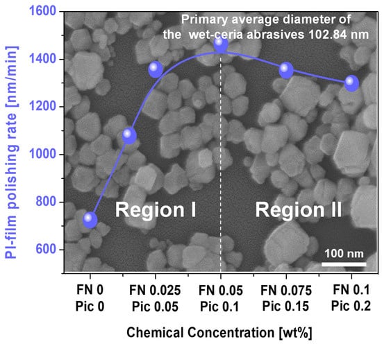 Polyimide film polishing rate depending on concentration of Fe(NO3)3 and picolinic acid in the CMP slurry. The background SEM images in Figure 1 exhibit the primary abrasive morphology and diameter of the wet ceria abrasives.