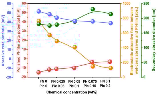 Properties of polyimide film CMP slurry: the secondary abrasive diameter and zeta potentials of the wet ceria abrasives and the polished surface of the polyimide film, varying depending on the Fe(NO3)3 and dispersant (i.e., picolinic acid) concentrations. The polyimide film CMP slurry was titrated at a pH of 5. The electrostatic attractive force was calculated relative to the zeta potentials of the wet ceria abrasives and the polished surface of the polyimide film.