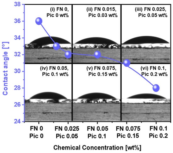The slurry adsorption degree (i.e., contact angle) depending on the Fe(NO3)3 concentration in the polyimide film CMP slurry. (i) Slurry without Fe(NO3)3 and slurries with (ii) 0.015, (iii) 0.025, (iv) 0.05, (v) 0.075, and (vi) 0.1 wt% of Fe(NO3)3 dropped onto the polished surface of polyimide.