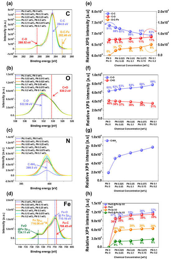Chemical deformation of the polished surface of polyimide depending on the Fe(NO3)3 concentration of the slurry. (a) C 1s, (b) O 1s, (c) N 1s, and (d) Fe 2p XPS spectra. (e) Relative C–C, C–O, and O–C–Fe, (f) C–O and C=O, (g) C–NH, and (h) Fe–O @ Fe 2p 3/2, Fe–C, Fe 2p 3/2, and Fe–O @ Fe 2p 2/1 bond intensities.