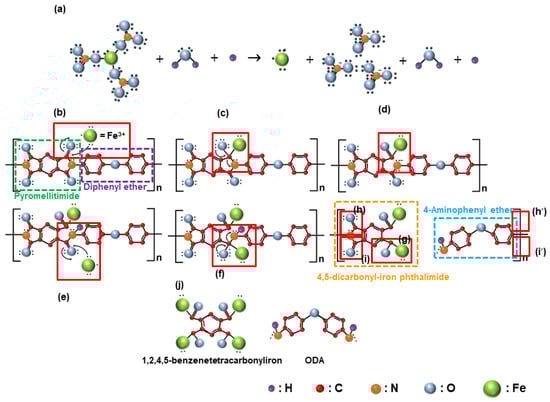 The mechanism of the chemical decomposition of the hard surface of the polyimide film into a soft surface (i.e., positively charged 1,2,4,5-benzenetetracarbonyliron and negatively charged ODA) through CMP using the slurry containing Fe(NO3)3 (a–j).