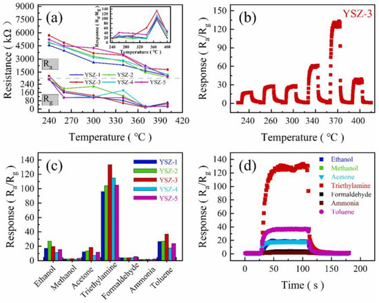 (a) Resistance (Ra and Rg) and response (inset) of YSZ-1-5 sensors to 100 ppm TEA at different operating temperatures, (b) dynamic response–recovery curves of YSZ-3 sensors to 100 ppm TEA at varying operating temperatures, (c) response of YSZ-1-5 sensors to 100 ppm of various gases at 370 °C, and (d) dynamic response curves of YSZ-3 sensors to 100 ppm of different gases at 370 °C [87].