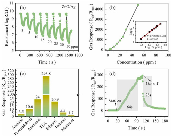 (a) Response transients and (b) line chart of ZnO/Ag to 1–50 ppm TEA at 200 °C, with log S-log C plots (inset in b), (c) response of ZnO/Ag to 10 ppm TEA and 100 ppm other gases at 200 °C, (d) response–recovery curves of 3D ZnO/Ag micro-octahedra to 10 ppm TEA [88].