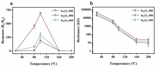 (a) Response values of all sensors to 7 ppm TEA at temperatures ranging from 25 to 200 °C, and (b) resistance values in air at different temperatures (25–200 °C) for the as-prepared In2O3 [89].