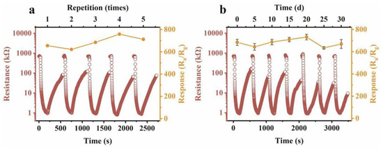 The response and recovery time reflect the speed of the resistance change in the sensor when it contacts or disengages from the gas being measured. Response time is defined as the time required for a gas sensor to maintain its sensitivity at its maximum or 90% after coming into contact with the target gas. Recovery time refers to the time required for the resistance value of a gas sensor to return to 90% of its original baseline resistance value after it is separated from the target gas and re-exposed to air.