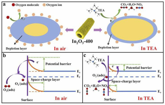 The space charge model, a widely accepted framework for interpreting gas sensing behavior in n-type metal oxide semiconductors, elucidates resistance modulation through three sequential processes: surface adsorption, redox reactions, and subsequent desorption. This mechanism involves charge carrier exchange between the semiconductor and adsorbed species, as illustrated in Figure 6. Upon air exposure, atmospheric oxygen molecules adsorb onto the yolk–shell ZnO surface, dissociating into reactive oxygen species (O2−, O−, O2−) that extract conduction band electrons, leading to upward band bending and depletion layer formation, consequently increasing material resistance. Conversely, TEA exposure triggers surface redox reactions between the analyte and chemisorbed oxygen species, releasing trapped electrons back into the conduction band, thereby reducing the depletion layer width and decreasing electrical resistance through charge carrier recombination. Equations (5)–(10) describe the adsorption and ionization of Oφ− on the surface of MOS materials at different operating temperatures and the reaction with TEA molecules adsorbed on the surface of MOS materials: