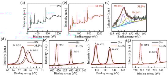 Figure 6d–g, the chemical states of Cs, Pb, Br, and I in 0% and 33.3% samples were confirmed by XPS data. The Cs 3d/2 and Cs 3d/2 junction energies of undoped and Mn-doped samples are 723.8 eV and 737.8 eV, respectively, and no obvious shift is observed, indicating that Mn