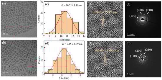 Figure 7g,h is the selected area electron diffraction pattern of the two samples. The doped samples exhibit more distinct diffraction rings, which aligns with the conclusion that the crystallinity of these samples is enhanced, as evidenced by the XRD analysis.