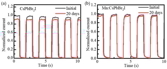 2I QDs films, respectively. The photocurrent of the Mn-doped device is 96% of the initial value, while that of the undoped device is only 89%. The transient photocurrent response stability within 20 days is significantly better than that of the device based on undoped QDs. The improvement of the environmental stability of Mn