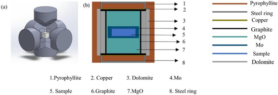 (a) Structure of the Chinese Hexagonal Top High Pressure Device. (b) Assembly diagram of the sample.