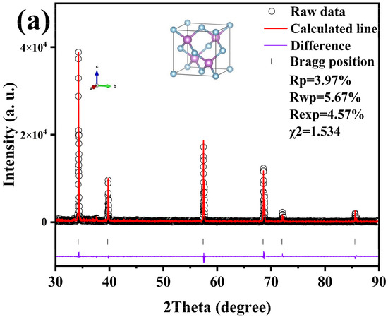 The diameter of the sintered sample is about 10 mm, and the thickness is about 4.5 mm. First, the surface of the sample is polished with sandpaper. In order to examine the phase structure of the samples, XRD spectra are usually collected using an X-ray diffractometer, which is a Rigaku SmartLab SE (Tokyo, Japan) with a range of 30–90° and a scanning step of 0.01°. The obtained XRD spectra are analyzed by professional software, such as Jade software (jade6.5). These software programs can be compared with standard crystal structure databases to determine the phase structure of the samples. The morphological characteristics of the fracture surfaces of the samples were also measured using a field emission scanning electron microscope (SEM, FEI Magellan, Hillsboro, OR, USA). The variable temperature electrical properties of the thermoelectric samples were tested using a JouleYacht Namicro-IIIL thermoelectric test system (Jiayitong, Sshenzhen, China).