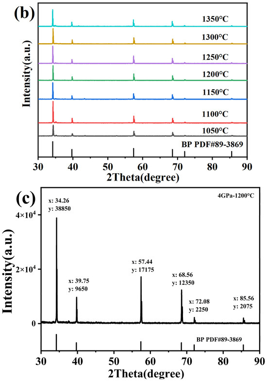 (a) XRD refinement of BP synthesized at a pressure of 4 GPa and at 1200 °C and crystal structure of BP. (b) X-ray diffraction patterns of BP synthesized at a pressure of 4 GPa and different synthesis temperatures. (c) Raw XRD of BP synthesized at a pressure of 4 GPa and at 1200 °C and crystal structure of BP.