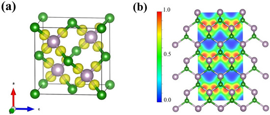 (a) Three-dimensional electron localization function (3D ELF) with an isosurface value of 0.75 and (b) two-dimensional electron localization function (2D ELF) slice along the (110) plane for F-43m BP calculated based on XRD pattern at 4 GPa.