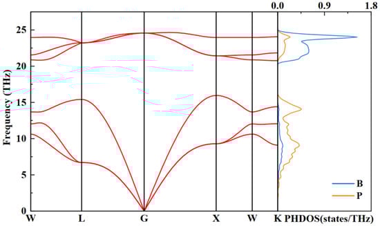To determine the dynamical properties of the BP structure, we researched the phonon spectrum and projected phonon density of states for the optimized F-43m structure at 4 GPa, as illustrated in Figure 7. Clearly, the phonon dispersion curves do not exist at imaginary frequencies within the first Brillouin zone, indicating the lattice dynamics stability of F-43m BP. In addition, the calculation results on the right panel of Figure 7 imply that the vibrational modes of the structure are distributed in the high-frequency and low-frequency regions. In the low-frequency region, the vibrational contribution of the P atoms is larger than that of the B atoms. Conversely, the B atoms contribute more significantly to the vibrations in the high-frequency region. This discrepancy can be ascribed to the fact that the P atoms possess a larger atomic mass than the B atoms.