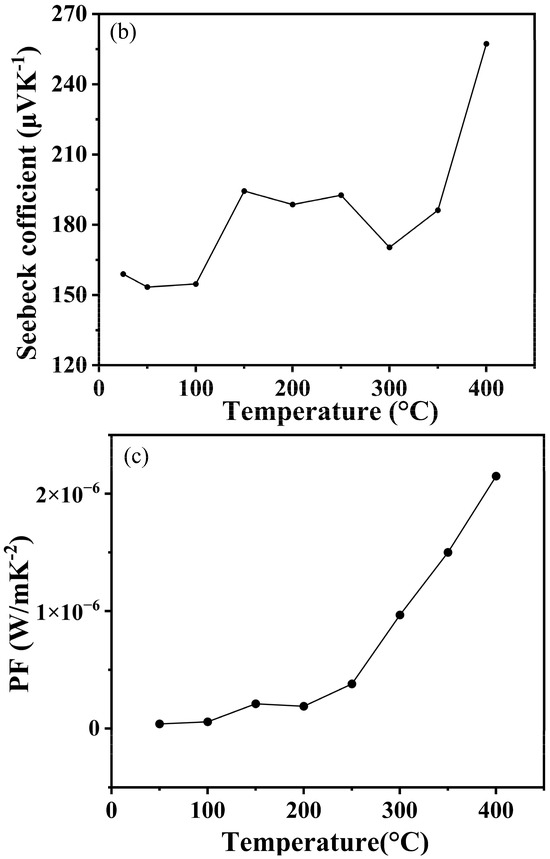 As shown in Figure 9a, the conductivity of boron phosphide (BP) samples varies with temperature after synthesis at different temperatures. Overall, it can be seen that the conductivity of boron phosphide shows a clear upward trend with increasing temperature. The reasons for this can probably be analyzed from three aspects: the enhancement of electronic thermal motion, the increase in carrier concentration and the change in crystal structure. Firstly, as the temperature rises, the thermal movement of electrons in boron phosphide will be more intense, thus gaining more energy, and the migration in the crystal lattice will become easier, which makes the conductivity of boron phosphide rise. Secondly, an increase in temperature will generally cause more electrons to jump from the valence band to the conduction band, resulting in an increase in the number of electrons in the conduction band, which will make the concentration of boron phosphide carriers increase, so the conductivity of boron phosphide will also increase. From the crystal structure to be analyzed, the increase in temperature may make the crystal structure of boron phosphide change slightly, and the defects or lattice vibration within the crystal are intensified, which is conducive to the scattering and migration of electrons, thus having a positive impact on the increase in electrical conductivity. Figure 9b shows the temperature dependence of the Seebeck coefficient for boron phosphide synthesized at 4 GPa and 1200 °C. The following is a detailed analysis of the graph: the temperature range in the graph is from 25 °C to 400 °C. The Seebeck coefficient ranges from 160 μV/K to 260 μV/K. The Seebeck coefficient decreases slightly between 25 °C and 100 °C from about 160 μV/K to about 150 μV/K. Between 100 °C and 200 °C, the Seebeck coefficient rises considerably to about 200 °C and 300 °C. Between 100 °C and 200 °C, the Seebeck coefficient fluctuates slightly but generally remains between 180 μV/K and 190 μV/K. Between 300 °C and 400 °C, the Seebeck coefficient rises sharply to about 260 μV/K. At about 100 °C, the Seebeck coefficient begins to rise significantly, indicating that the thermoelectric properties of boron phosphide change significantly in this temperature range. Between 300 °C and 400 °C, the Seebeck coefficient increases sharply, indicating that the thermoelectric properties of boron phosphide are further enhanced in this temperature range. The change in the Seebeck coefficient may be related to the change in electronic structure and energy band structure of boron phosphide with temperature. At high temperatures, the electron mobility and carrier concentration of boron phosphide may change, leading to a significant increase in the Seebeck coefficient. As shown in Figure 9c, which shows the trend of power factor of boron phosphide with temperature, it can be clearly seen that its power factor increases with increasing temperature. This is also in line with the nature of semiconductor materials, where the electrical properties increase with increasing temperature. Overall, the figure shows the trend of the Seebeck coefficient of boron phosphide as a function of temperature at 4 GPa and 1200 °C. The figure shows the temperature dependence of the Seebeck coefficient of boron phosphide for all temperature conditions. The positive values of the Seebeck coefficient at all temperature conditions indicate that the boron phosphide (BP) materials synthesized under these conditions are P-type semiconductors. The sharp increase in the Seebeck coefficient in the temperature range from 350° to 400° coincides with the sudden drop in conductivity at this temperature, which may be related to the fact that the raw material used is an amorphous boron powder, leading to the volatilization of the sample in this temperature range at atmospheric pressure. Meanwhile, we can see that the conductivity is 4 S/m at room temperature, which is an improvement. In addition, the advantage of using amorphous feedstock is the cheap cost and the simplicity of preparation without a precursor compared to using crystalline boron and phosphorus source as feedstock to synthesize boron phosphide.