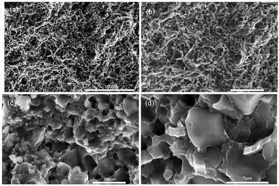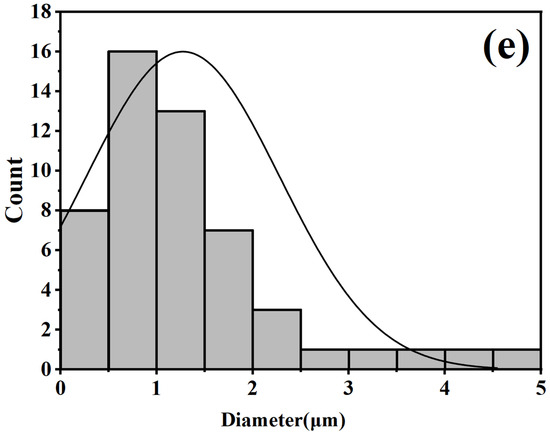 The picture (Figure 10) shows scanning electron microscope (SEM) images of boron phosphide samples synthesized at a pressure of 4 GPa. The images show the fracture surface morphology of the samples at different scales of 100 μm, 50 μm, 10 μm and 5 μm, respectively. From the 100 μm scale image, it can be seen that the morphology of the surface of the sample is rougher, with many irregular concave and convex structures on the surface. In the 50 μm scale image, the details are clearer, and more particles and cracks can be seen. The irregularities on the surface are more obvious, showing the complex structure inside the sample. In the 10 μm scale image, the details are clearer, and smaller particles and cracks can be seen. Surface roughness and irregularities are more pronounced. The 5 μm scale image shows the most detail, and the smallest particles and cracks can be seen. The microstructure of the surface is very clear, showing the complex details inside the sample. From the statistical distribution of grains in Figure 10e, it can be seen that some grains have their diameter sizes between the nanometer scale and the micrometer scale. Figure 10e, it can be seen that there are some grains of a few hundred nanometers in the sample. Overall, the boron phosphide sample has a multi-sized structure under high-pressure 4 GPa conditions. These SEM images demonstrate the fractured surface morphology of the boron phosphide samples at different scales, indicating the presence of complex microstructures and irregular surface morphology inside the samples. This information is important for understanding the physical and chemical properties of the material and its applications.