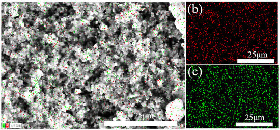 In order to determine the elemental distribution of the boron phosphide samples, we used an energy spectrometer (EDS) for the analysis. As shown in Figure 11, the red part is the distribution of phosphorus, and the green part is the distribution of boron; we can see that the elements of phosphorus and boron are uniformly distributed on the crystal, and the distribution of boron will be slightly less than that of phosphorus because the X-ray is weak at detecting elements with small atomic numbers, so the detected boron elements are less compared with the actual ones. The scale of the image is 25 microns, indicating that this is an elemental distribution analysis on a micron scale. Overall, this EDS elemental distribution map shows a uniform distribution of phosphorus and boron elements in the boron phosphide material, indicating that the preparation process of the material is more successful, with uniform elemental distribution and no obvious segregation.