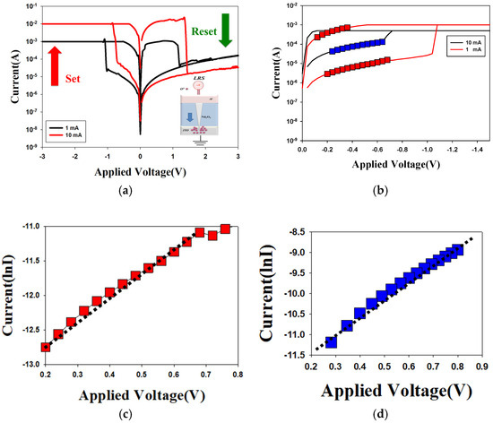 The I-V curves of the neodymium oxide film’s RRAM device with a TiN electrode under different (a) compliance current processes and (b) conduction mechanisms (c) ohmic conduction for low electrical voltage, and (d) hopping conduction for high electrical voltage.