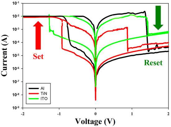 The I-V curves of the neodymium oxide film’s RRAM device for different top electrode materials (Al, TiN, and ITO).