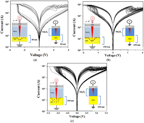 To compare the effects of oxygen ion concentration distribution on the electrical properties of the film’s RRAM devices, different ITO top electrode material thicknesses of 80, 150, and 300 nm were fabricated and demonstrated in Figure 12. In the insert of Figure 12a–c, the left image depicts the electron transfer model, while the right image represents the MIM structure of the neodymium oxide film’s RRAM device. In Figure 12a, the set and reset voltages of the RRAM devices for the 80 nm ITO top electrode materials were observed to be −1.5 V and 1.5 V, respectively. In Figure 12b,c, the set and reset voltages decreased as the top ITO electrode thickness increased from 80 nm to 300 nm. In addition, the real physical model and the RRAM device’s structure for the set state are also presented in the insert of Figure 12a. In addition, the set and reset voltages of the RRAM devices decreased as the ITO top electrode material’s thickness increased and might have contributed to the oxygen ion concentration distribution effect from 80 nm to 300 nm, as shown in Figure 12b,c.
