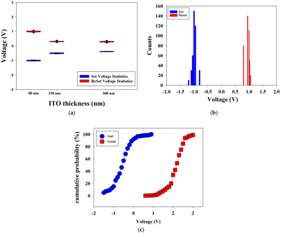 The set/reset voltage statistics of the neodymium oxide film’s RRAM device using ITO as the top electrode materials for 80 nm with (a) different thicknesses compared, (b) counts distribution, and (c) cumulative probability.