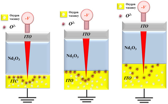 In addition, the reset statistical results indicate that the reset voltage increased as the thickness of the neodymium oxide films increased. The increasing reset voltage may be due to the diffusion of oxygen ions in the range of the ITO electrode in the set operation process, as explained in Figure 15. When the high reverse bias was applied in the reset process, the oxygen ions must have been driven back to the neodymium oxide film’s switching layer. The physical model depicting the effect of oxygen concentration distribution effect in relation to different ITO electrode thicknesses is shown in Figure 15.
