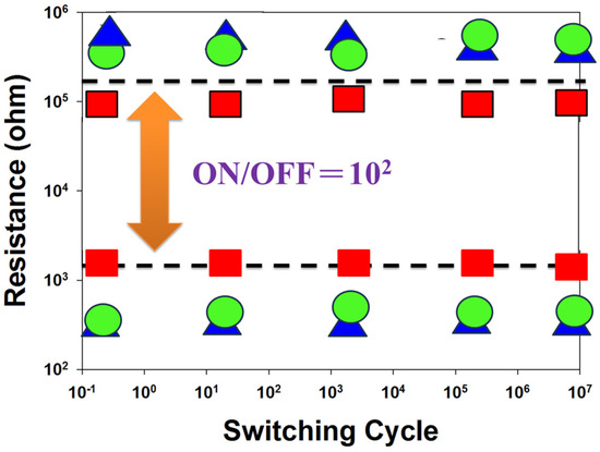 Figure 18 presents the resistance value versus the switching cycle curves of the neodymium oxide film’s RRAM devices with ITO (red), TiN (green), and aluminum (blue) as the top electrode materials. The neodymium oxide film’s RRAM device showed no significant changes in the ON/OFF ratio switching behavior cycling versus the time curves for more than 102 s in the extrapolation calculation anticipation.