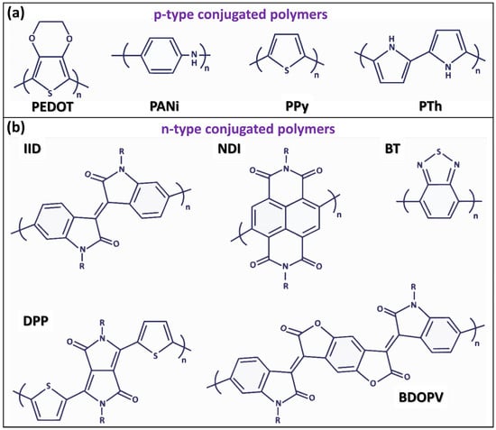 - Gharahcheshmeh, M.H.; Gleason, K.K. Conjugated polymers for flexible energy harvesting and storage devices. In Conjugated Polymers for Next-Generation Applications; Elsevier: Amsterdam, The Netherlands, 2022; Volume 2, pp. 283–311. [Google Scholar]