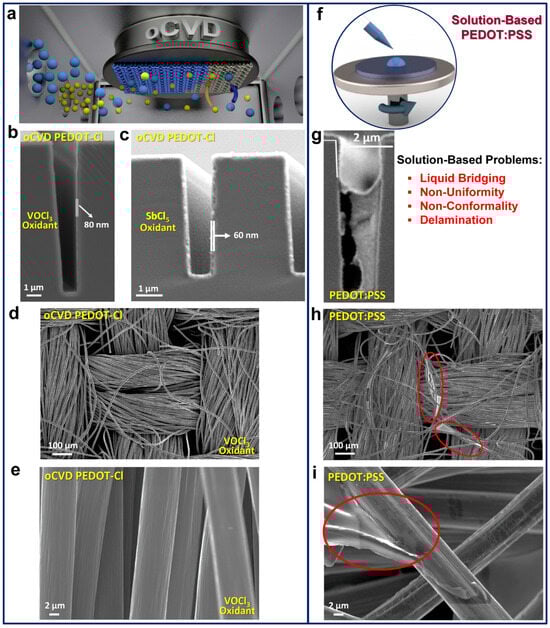 - Gleason, K.K. Three-Dimensional (3D) Device Architectures Enabled by Oxidative Chemical Vapor Deposition (oCVD). Org. Mater. 2022, 4, 261–267. [Google Scholar] [CrossRef]