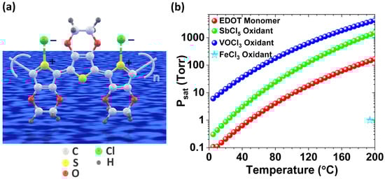 - Mirabedin, M.; Vergnes, H.; Caussé, N.; Vahlas, C.; Caussat, B. An out of the box vision over oxidative chemical vapor deposition of PEDOT involving sublimed iron trichloride. Synth. Met. 2020, 266, 116419. [Google Scholar] [CrossRef]