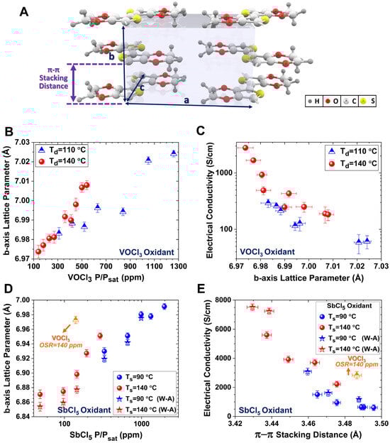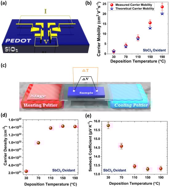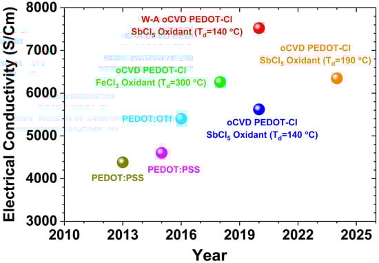 - Heydari Gharahcheshmeh, M.; Dautel, B.; Chowdhury, K. Enhanced Carrier Mobility and Thermoelectric Performance by Nanostructure Engineering of PEDOT Thin Films Fabricated via the OCVD Method Using SbCl5 Oxidant. Adv. Funct. Mater. 2025, 35, 2570056. [Google Scholar] [CrossRef]