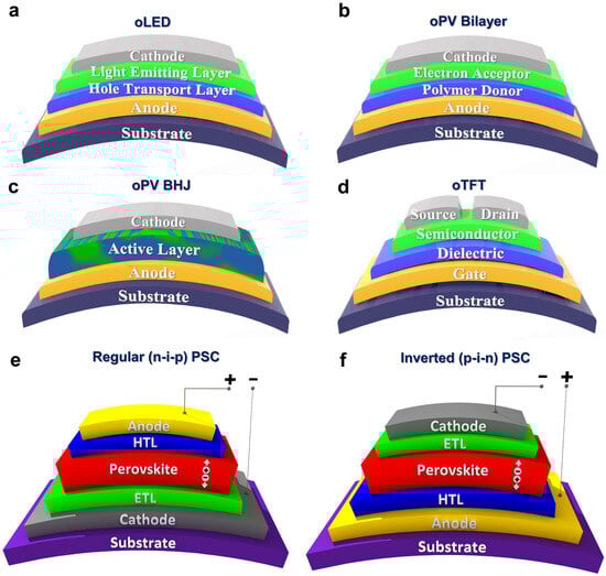 - Sirringhaus, H.; Brown, P.; Friend, R.; Nielsen, M.M.; Bechgaard, K.; Langeveld-Voss, B.; Spiering, A.; Janssen, R.A.; Meijer, E.; Herwig, P. Two-dimensional charge transport in self-organized, high-mobility conjugated polymers. Nature 1999, 401, 685–688. [Google Scholar] [CrossRef]