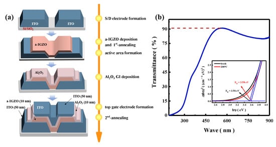 (a) Schematic of fabrication process, and (b) the measured transmittance of the a-IGZO TG-TFT device across various wavelengths, and the insert is the calculated band gap energy for a 130 nm a-IGZO film on a quartz substrate.