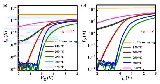 (a,b) These are transfer characteristics of TG-TFTs with different first-annealing treatments under VD = 0.1 V and VD = 3 V, respectively.