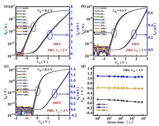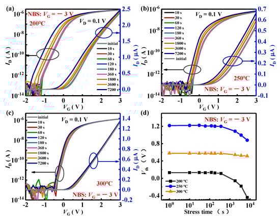 The NBS results of a-IGZO TG-TFTs were presented in Figure 4. The transfer characteristics of all TG-TFTs exhibited negative shifts after a 7200 s stress duration under the Vstress = −3 V condition, which is similar to the trends that appeared in other n-type oxide semiconductor (e.g., TiO2, SnO2) TFTs [31,32], as shown in Figure 4a–c. The negative shifts in Vth are attributed to the fact that holes were difficult to be generated in n-type oxide semiconductors [16]. The ΔVth values between the initial and the 7200 s negative-biased transfer curves at VD = 0.1 V were −0.573 V (200 °C), −0.335 V (250 °C), and −0.044 V (300 °C). It was evident that the NBS stabilities of the TG-TFTs were improved with increasing first-annealing temperature, with the 300 °C first-annealed device exhibiting the best NBS stability. The excellent NBS stability would make a-IGZO TG-TFTs very advantageous for applications in the field of transparent displays.