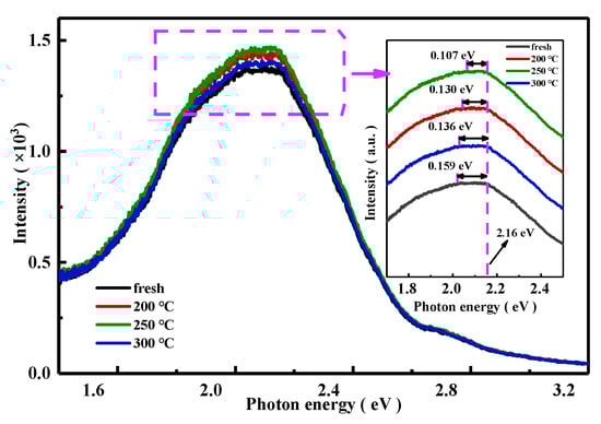 PL spectra for a-IGZO films under different first-annealing temperatures of fresh, 200 °C, 250 °C, and 300 °C, respectively; insert is separated PL spectra in the range of 1.7–2.5 eV.