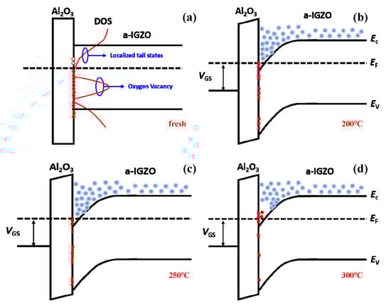 Figure 5 and the insert figure showed the PL spectra and separated PL spectra of a-IGZO films with first-annealing at fresh (no first-annealing), 200 °C, 250 °C, and 300 °C. Four broad emission peaks were found in the visible light range of 1.6~3.2 eV, which is consistent with previous reports [33,34,35,36]. From the insert of Figure 5, every peak was observed with a flat top, of which the maximum energy for all peaks was at 2.16 eV. The result meant that the deepest defect in all a-IGZO films was located at 2.16 eV below the conduction band bottom (VBM) [37]. In addition, the energy bands occupied by the flat top of the measured peaks were 0.159 eV (fresh), 0.130 eV (200 °C), 0.107 eV (250 °C), and 0.136 eV (300 °C), respectively. The peak intensity and width of the energy band of the flat top in the PL spectra may illustrate the density and the distribution range of defects in the a-IGZO film [34,35,38]. The flat band width of the a-IGZO film annealed at 300 °C in the PL spectrum decreased by 0.023 eV compared to the fresh a-IGZO film. The bandgap of a-IGZO increased by 0.02 eV after the 300 °C annealing treatment, as shown in the insert of Figure 1b. These results indicated that tail states at the bottom of the conduction band of the a-IGZO film shifted upward by about 0.02 eV after the 300 °C annealing treatment. The PL curve of the a-IGZO film with first-annealing at 250 °C exhibited the highest peak intensity and the narrowest energy band (0.107 eV) of the flat top, while the PL spectra of the a-IGZO film without first-annealing showed the lowest peak intensity and the widest energy band (0.159 eV). These results demonstrated that the O defects in the a-IGZO film with first-annealing at 250 °C were at the deepest energy level, which might result in the largest positive Vth observed in the corresponding TG-TFT, as shown in Figure 2a,b. The PL spectra of the a-IGZO film with the 300 °C first-annealing treatment showed a lower peak intensity but a wider energy band (0.136 eV) of the flat top compared to the 250 °C first-annealed a-IGZO film. This result might suggest that some shallow defect states were generated in the 300 °C first-annealed a-IGZO film as the overall number of defects decreased [9]. It is known that H2O is difficult to be adsorbed on the surface of a-IGZO when the temperature is above 300 °C. In addition, M-OH in a-IGZO reacted with another M-OH to evaporate a H2O molecule, and left an ionized oxygen vacancy and two electrons. This is why shallow defect states were generated in the 300 °C first-annealed a-IGZO film [17]. The band diagram explained the changes in the defects observed in the PL spectrum, as shown in Figure 6. In the a-IGZO film first-annealed at 200 °C, the VO concentration was significantly reduced compared to the fresh a-IGZO film, as shown in Figure 6b. The a-IGZO film first-annealed at 250 °C has a higher VO concentration than those first-annealed at 200 °C and 300 °C, with the VO states in a-IGZO first-annealed at 250 °C occupying the central region of the bandgap, as shown in Figure 6c. In contrast, the a-IGZO film first-annealed at 300 °C had a lower VO concentration compared to that first-annealed at 200 °C, but the VO were mainly distributed at shallower energy levels below the conduction band, as illustrated in Figure 6d. And this might be the reason for the higher mobility observed in the TG-TFT with the 300 °C first-annealing treatment compared to the TG-TFT with 250 °C first-annealed a-IGZO, as shown in Table 1.